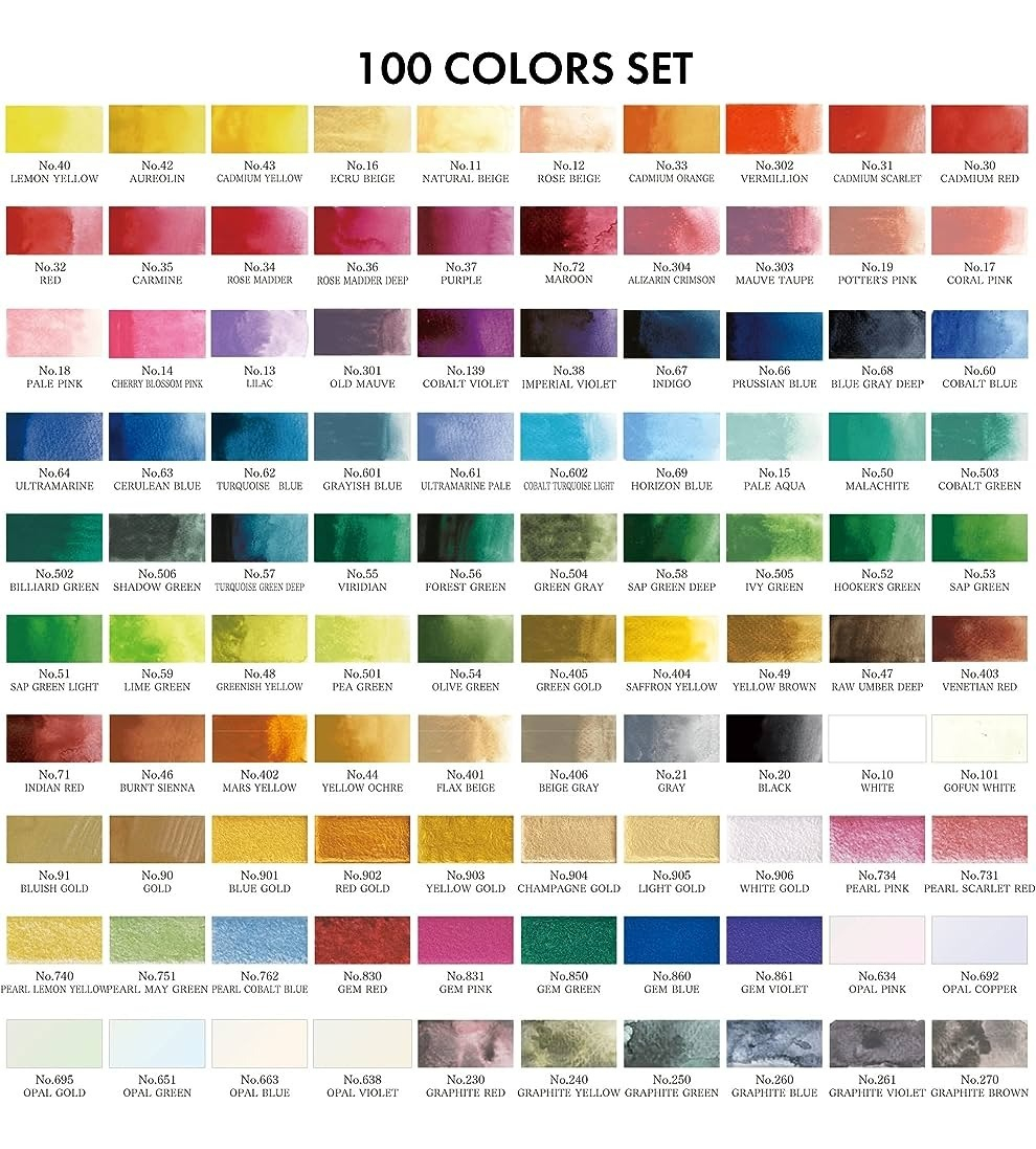 10 White, 101 Gofun White, 11 Natural Beige, 12 Rosa Beige, 13 Lilac, 139 Cobalt Violet, 14 Cherry Blossom Pink, 15 Pale Aqua, 16 Ecru Beige, 17 Coral Pink, 18 Pale Pink, 19 Potters Pink, 20 Black, 21 Gray, 230 Graphite Red, 240 GRaphite Yellow, 260 Graphite BLue, 261 Graphite Violet, 270 Graphite Brown, 30 Cadmium Red, 301 Old MAuve, 302 Vermillion, 303 Mauve Taupe, 304 Alizarin Crimson, 31 Cadmium Scarlet, 32 Red, 33 Cadmium Orange, 34 Rose Madder, 35 Carmine, 36Rose Madder Deep, 37 Purple, 38 Imperial Violet, 40 Lemon yellow, 401 Flax Beige, 402 MArs Yellow, 403 Venetian Red, 404 Saffron Yellow, 405 Green Gold, 406 Beige Gray, 43 Cadmium Yellow, 44 Yellow Ochre, 46 Burnt Siena, 47 Raw Umber Deep, 48 Greenish Yellow, 49 Yellow Brown, 50 MAlachite, 501 Pea Green, 502 Billiard Green, 503 Cobalt Green, 504 Green Gray, 505 Ivy Green, 51 Sap Green Light, 52 Hookers Green, 53 Sap Green, 54 Olive Green, 55 Viridian, 56 Forest Green, 57 Turquoise Deep, 58 Sap Green Deep, 59 Lime Green, 60 Cobalt Blue, 601 Grayish Blue, 602 Cobalt Turquoise Light, 61 Ultramarine Pale, 62 Turquoise Blue, 63 Cerulean Blue, 634 Opal Pink, 638 Opal Violet, 64 Ultrmarine, 651 Opal Green, 66 Prussian Blue, 663 Azul Ópalo, 67 Indigo, 68 Blue Gray Deep, 69 Horizon Blue, 692 Opal Copper, 695 Opal Gold, 71 Indian Red, 72 Maroon, 731 Pearl Scarlet Red, 734 Pearl Pink, 740 Pearl Lemon Yellow, 751 Pearl May Green, 762 Pearl Cobalt BLue, 830 Gem Red, 831 Gem Pink, 850 GemGreen, 860 Gem Blue, 861 Gem Violet, 90 Gold, 901 Blue Gold, 902 Red Gold, 903 Yellow gold, 904 Champagne Gold, 905 Light Gold, 906 White Gold, 91 Bluish Gold, Dorado, Grafito/Verde
