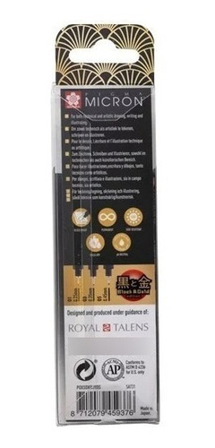 Este set contiene 3 rotuladores Pigma Black & Gold Edition con los tamaños de punta más exitosos: 1 x 01 (0.25 mm), 1 x 03 (0.35 mm), 1 x 05 (0.45 mm).
