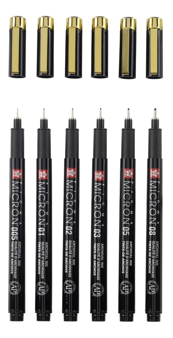 Kit de 6 estilógrafos Sakura Pigma Micrón Edición Limitada Negro y Oro (Black & Gold Edition) con puntas: 005, 01, 02, 03, 05 y 08.