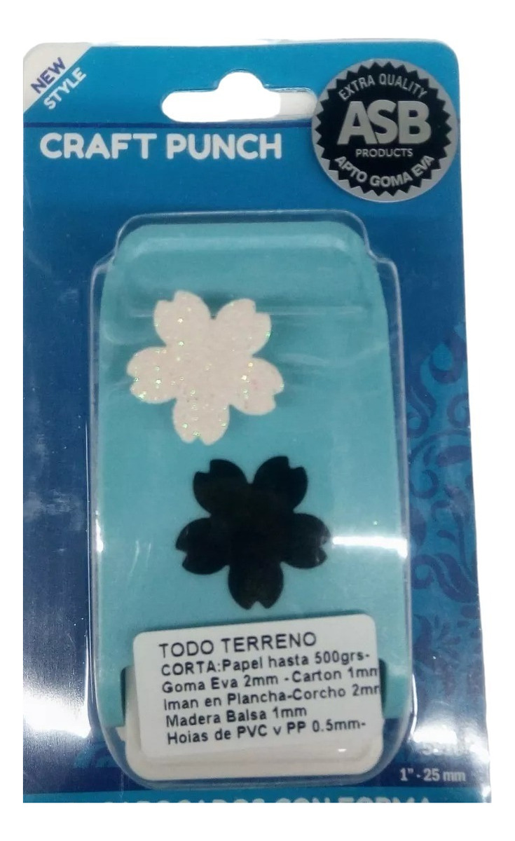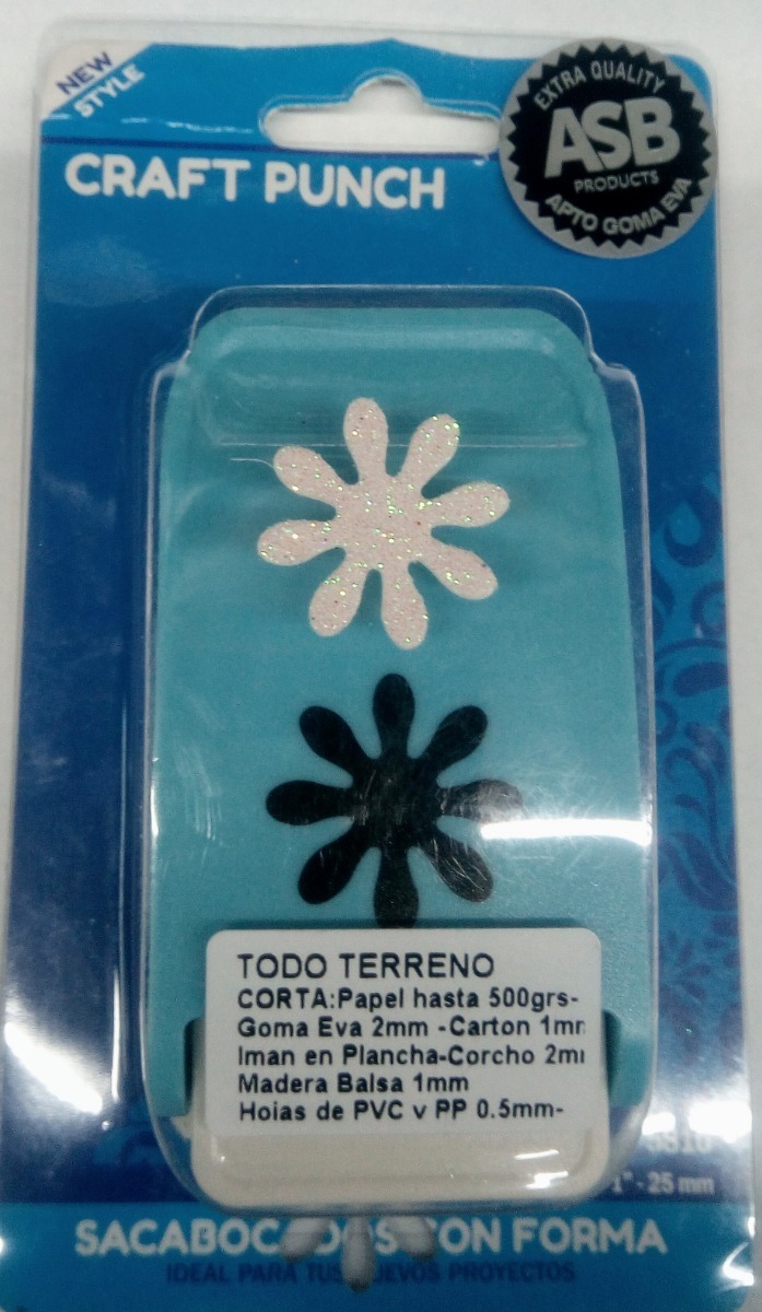 Troqueladora Flor Todo Terreno Asb 38 Mm. Perforadora con forma especial para perforar : Goma eva: 2 mm, Carton: 1 mm,Plancha de iman, Corcho: 2 mm, Madera balsa: 1 mm ,Hojas de PVC y PP: 0.5 mm